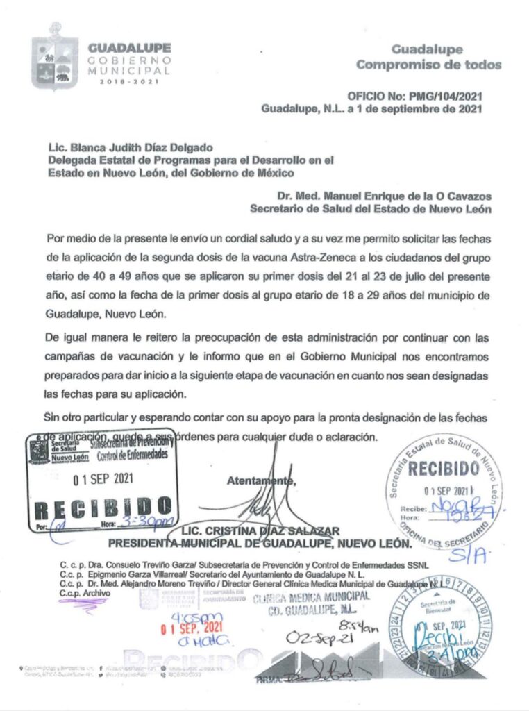 Al afirmar que la salud de los ciudadanos es prioridad, la alcaldesa de Guadalupe, Cristina Díaz, solicitó al Gobierno Federal y a la Secretaría de Salud Estatal, designar las fechas para la segunda dosis del grupo de 40 a 49 años, así como la primera aplicación para el segmento de 18 a 29 años.