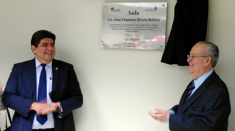 La Facultad de Derecho y Criminología de la UANL, rindió un homenaje al maestro Juan Francisco Rivera Bedoya, con la colocación de una placa en un salón que llevará su nombre, en ceremonia realizada en el Auditorio de Posgrado.