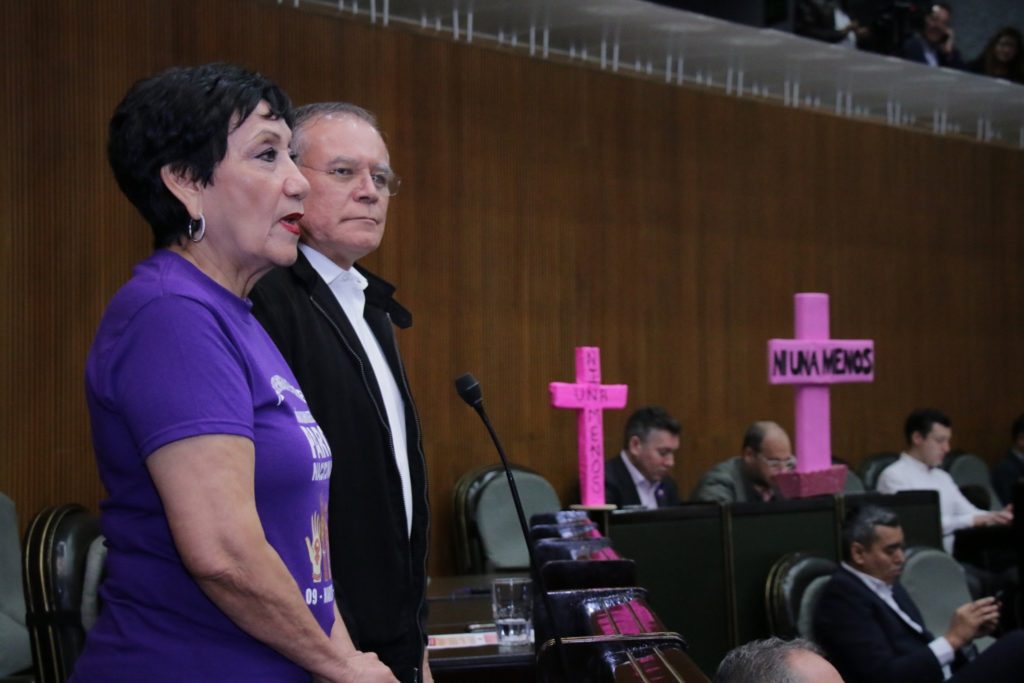 Previamente, en las curules de Karina y Tabita Ortiz, se instaló una cruz rosa con la frase “ni una menos”, mientras que los sitiales de las legisladoras panistas se colocaron pancartas y playeras con la frase “yo soy vida”.