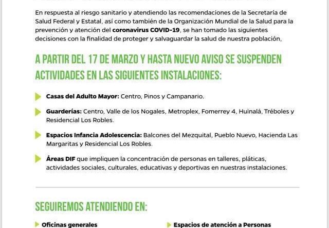 Con la finalidad de proteger y salvaguardar la salud de la población, el DIF de Apodaca tomó la decisión de suspender actividades en diferentes instalaciones, a partir del 17 de marzo y hasta nuevo aviso.