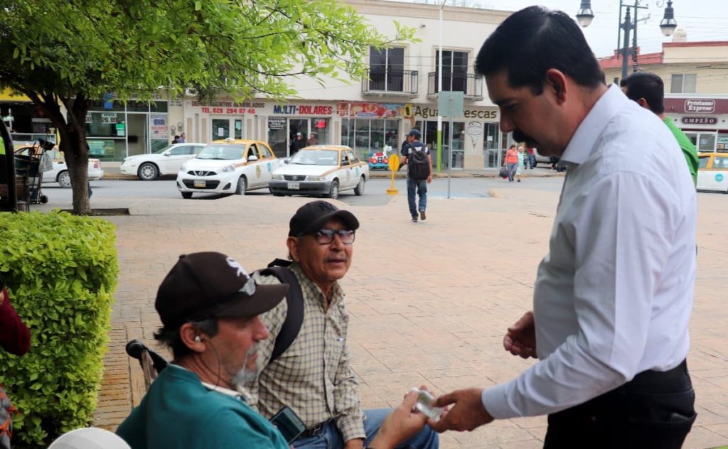 Iniciando con en el primer cuadro de la ciudad el alcalde repartió pequeños recipientes con gel antibacterial a los ciudadanos que se encontraban en la plaza principal Miguel Hidalgo.