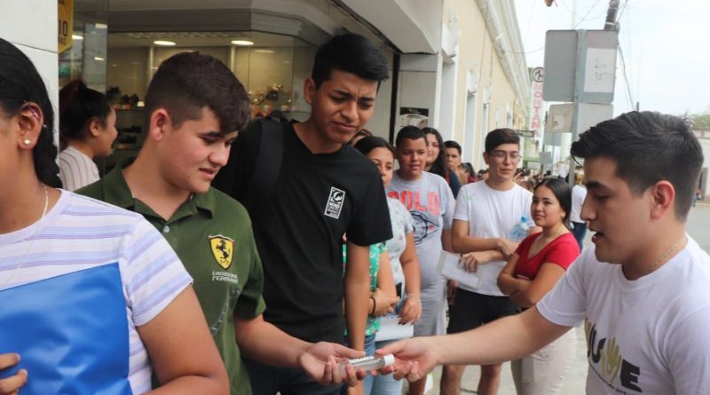 Personal del INJUVE en Cadereyta también realizo la entrega de gel antibacterial a los jóvenes que se encontraban en el primer cuadro del municipio como medida preventiva ante el coronavirus.