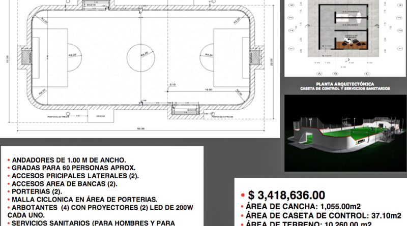 El proyecto que se realizará en un terreno de 10 mil metros cuadrados, contará con una área de cancha de 1,055 metros cuadrados, área de caseta de control, andadores de 1 metro de ancho, gradas con capacidad para 160 personas, dos accesos principales laterales, área de bancas, lámparas LED, oficina administrativa y sanitarios para hombres y mujeres.