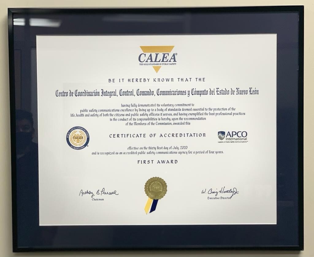 El Centro de Coordinación Integral, de Control, Comando, Comunicaciones y Cómputo del Estado (C5), recibió esta semana el documento oficial que lo acredita internacionalmente como un Centro con estándares de excelencia, marcados por la calificadora internacional Commission on Accreditation for Law Enforcement (CALEA).