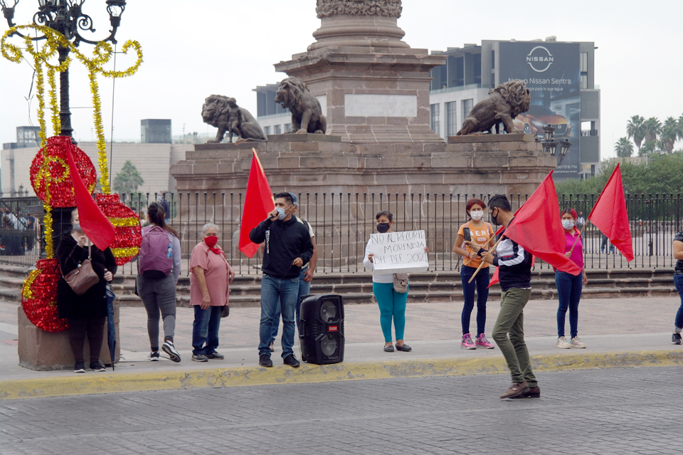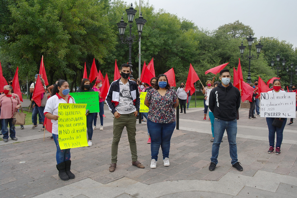 Con una cadena humana, integrantes de Antorcha Campesina manifestaron su rechazo al recorte de recursos que otorgará el Gobierno Federal a Nuevo León para el 2021.