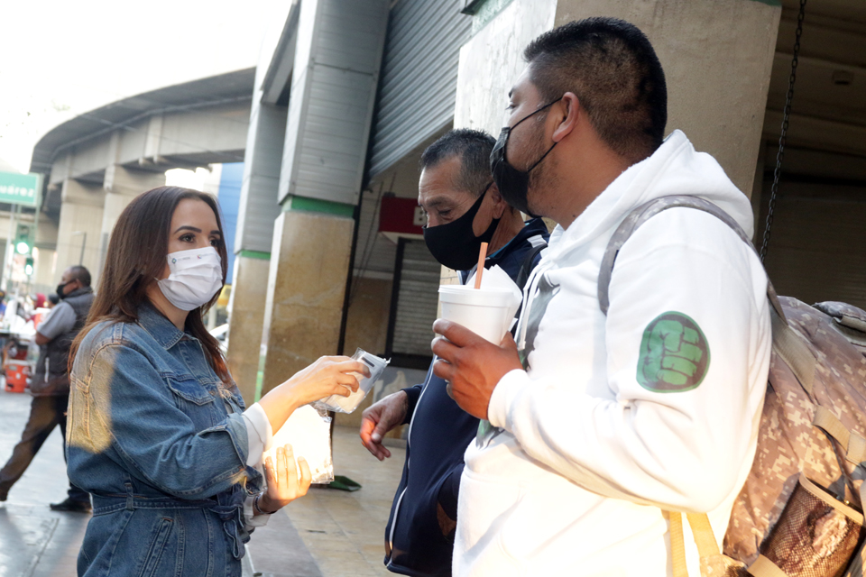 Más tarde, alrededor de las 7:00 horas, Flores Carrales recorrió el acceso de la Estación del Metro Cuauhtémoc, donde también entregó cubrebocas junto a la Secretaria General de Morena, Citlalli Hernández.