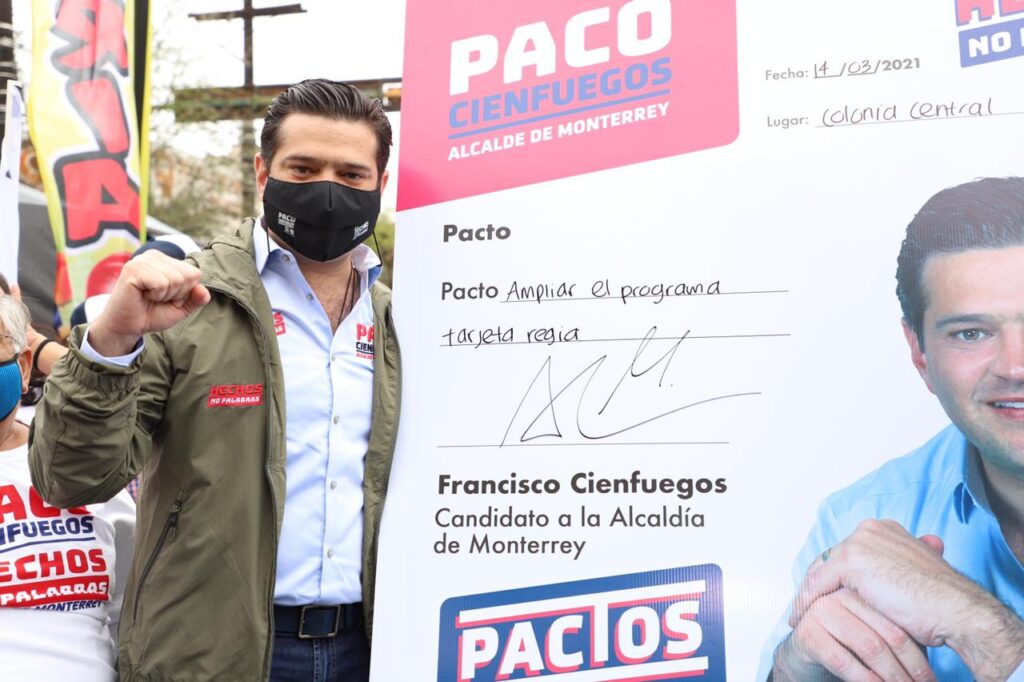 Con el objetivo de mejorar el bienestar de las mujeres en situación vulnerable y contribuir a la economía familiar, el candidato de la coalición PRI-PRD: “Va Fuerte por Nuevo León”, a la alcaldía de Monterrey, Paco Cienfuegos, pactó ampliar el número de apoyos del programa “Tarjeta Regia” para favorecer a 20 mil mujeres más y llegar así a un total de 60 mil beneficiarias.