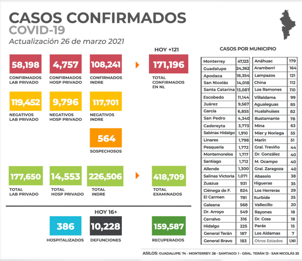 Asimismo se dio a conocer que se presentaron 121 nuevos casos para sumar 171 mil 196.