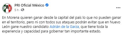 En sus redes sociales, la dirigencia del CEN del PRI enfatizó que ni con todos sus ataques podrán evitar que Adrián de la Garza, que tiene toda la experiencia y capacidad para gobernar tan importante estado, se lleve el triunfo y sea Gobernador.