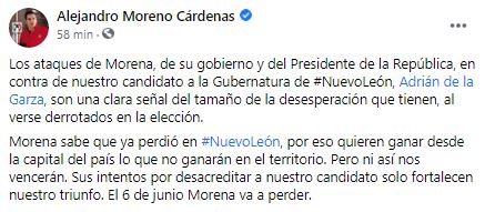 Los ataques de Morena, de su gobierno y del Presidente de la República, en contra de nuestro candidato a la gubernatura de Nuevo León, Adrián de la Garza, son una clara señal del tamaño de la desesperación que tienen, al verse derrotados en la elección, afirmó Alejandro Moreno, presidente del CEN del PRI.