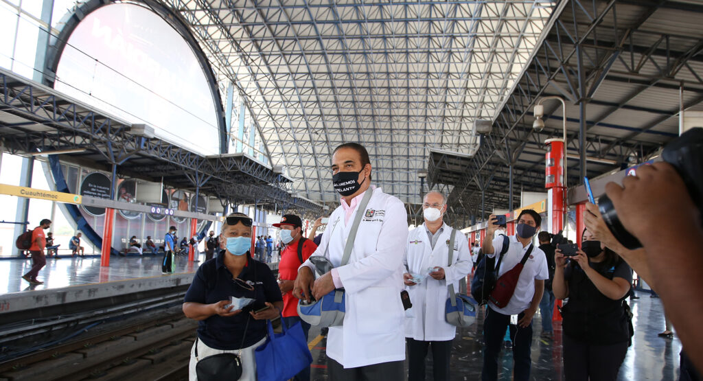 Antes, en la Estación Zaragoza el funcionario, acompañado de autoridades de esta dependencia, abordaron el Metro para constatar el uso de esta herramienta que ayuda a evitar el contagio del COVID-19.