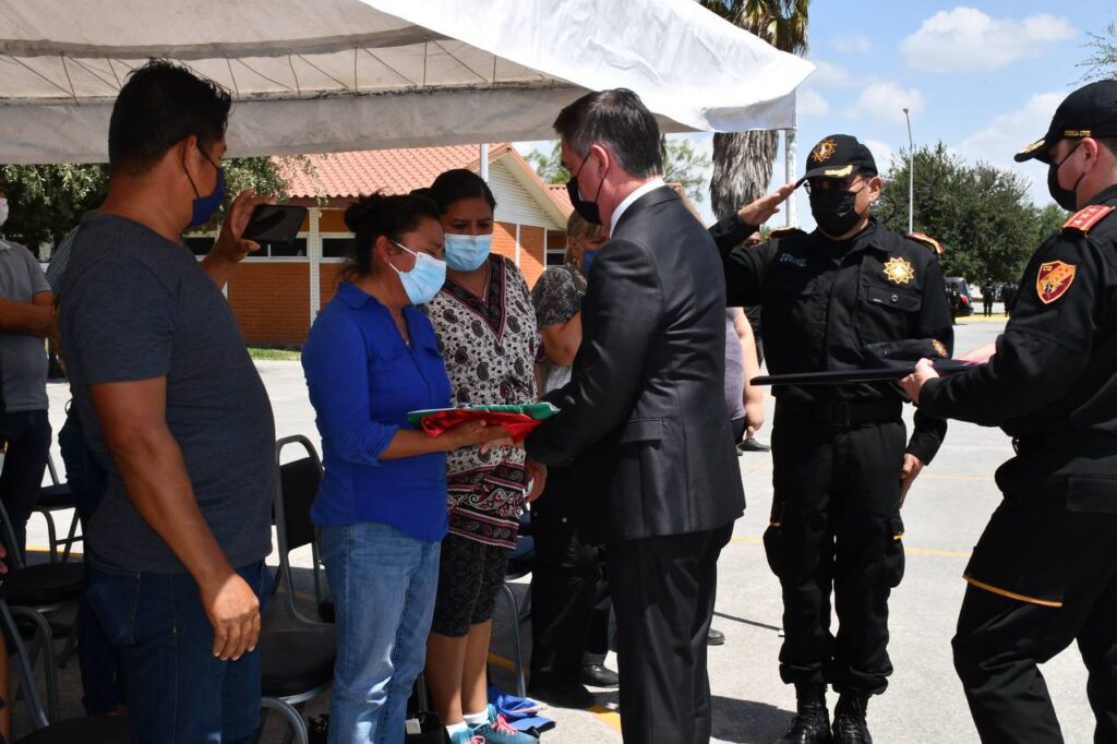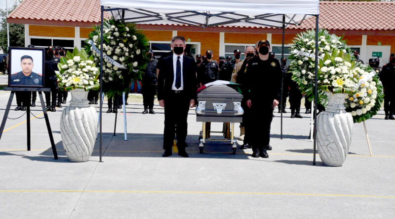 La ceremonia se realizó en el Campo Policial No.1 de Fuerza Civil hasta donde llegaron los restos del policía José Eduardo Hernández Rojas, así como su madre y familiares, quienes recibieron de manos del secretario de Seguridad Pública, Aldo Fasci, la bandera de México que cubría el féretro.
