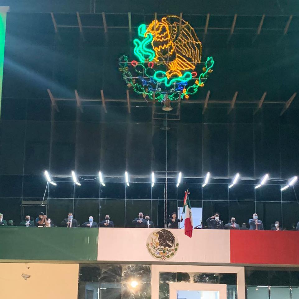 Fue en punto de las 9 de la noche, cuando la Alcaldesa Elizabeth Galicia Ruiz encabezó la Ceremonia Virtual del 211 Aniversario de la Independencia de México desde el balcón de la Torre Administrativa, acompañada por el Diputado Federal Héctor Castillo Olivares, el Legislador Local Roberto Carlos Farías García, síndicos, regidores y secretarios de la Administración.