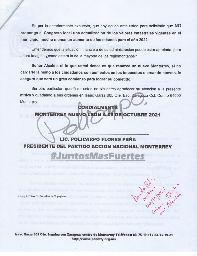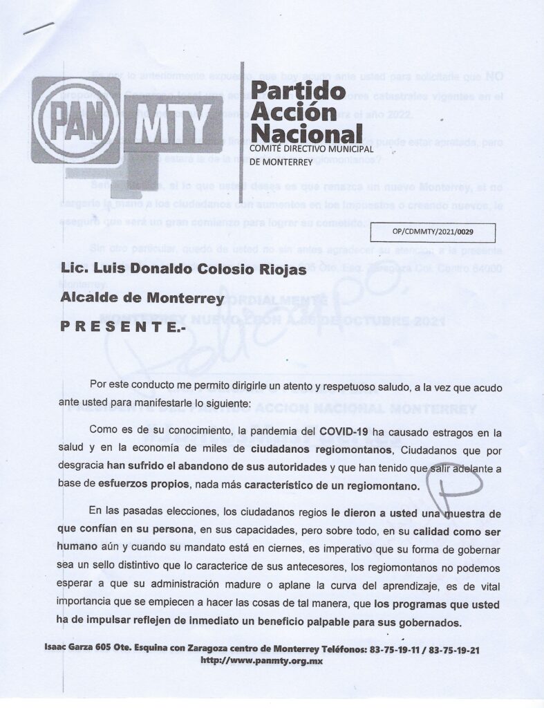 El líder blanquiazul en Monterrey acudió al despacho de Luis Donaldo Colosio, en donde mediante un escrito exhortó al munícipe a que de igual forma no considere dentro de sus proyecciones y planes presupuestales para 2022 la actualización de valores catastrales que le permite la ley.