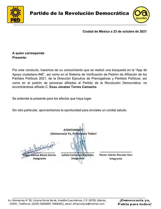 “Por este conducto hacemos de su conocimiento que se realizó una búsqueda en la “App de apoyo ciudadano-INE”, así como en el Sistema de Verificación de Padrón de Afiliación de los Partidos Políticos 2021”, de la Dirección Ejecutivo de Prerrogativas y Partidos Políticos, así como en el padrón de personas afiliadas al Partido de la Revolución Democrática, no encontrándose afiliado C. Esau Jonatan Torres Camacho”, detalla el escrito.