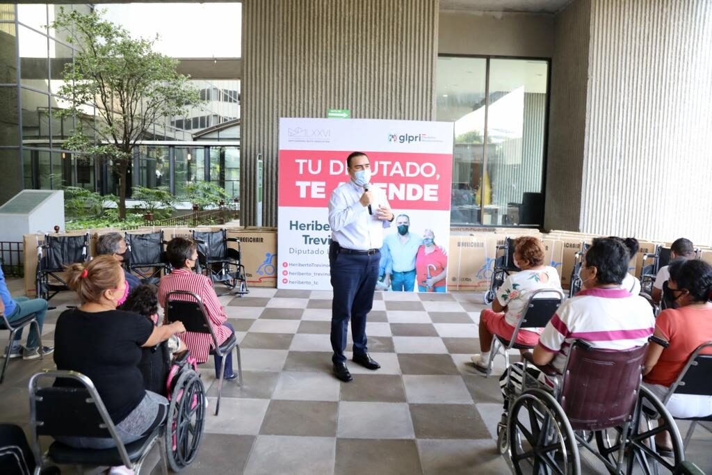Para mejorar la calidad de vida de las personas con alguna discapacidad o padecimiento psicomotriz, el coordinador del Grupo Legislativo del PRI, Heriberto Treviño Cantú, entregó 20 sillas de ruedas a igual número de ciudadanos en un evento realizado en la explanada del Congreso local.