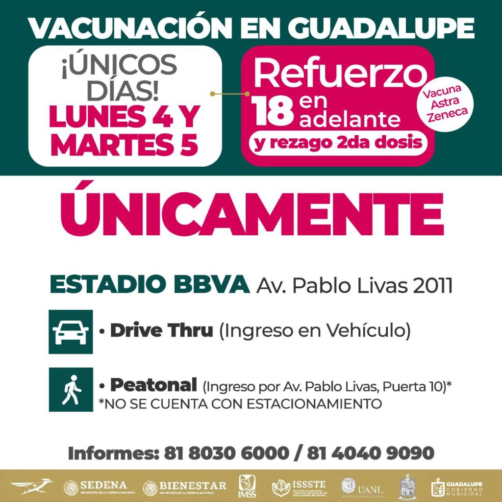 Este próximo lunes y martes, serán los dos únicos días para recibir la dosis AstraZeneca en los módulos que se habilitarán en el Estadio de Rayados, uno en modalidad Drive Thru y otro peatonal, en un horario de 8 de la mañana a 2 de la tarde.