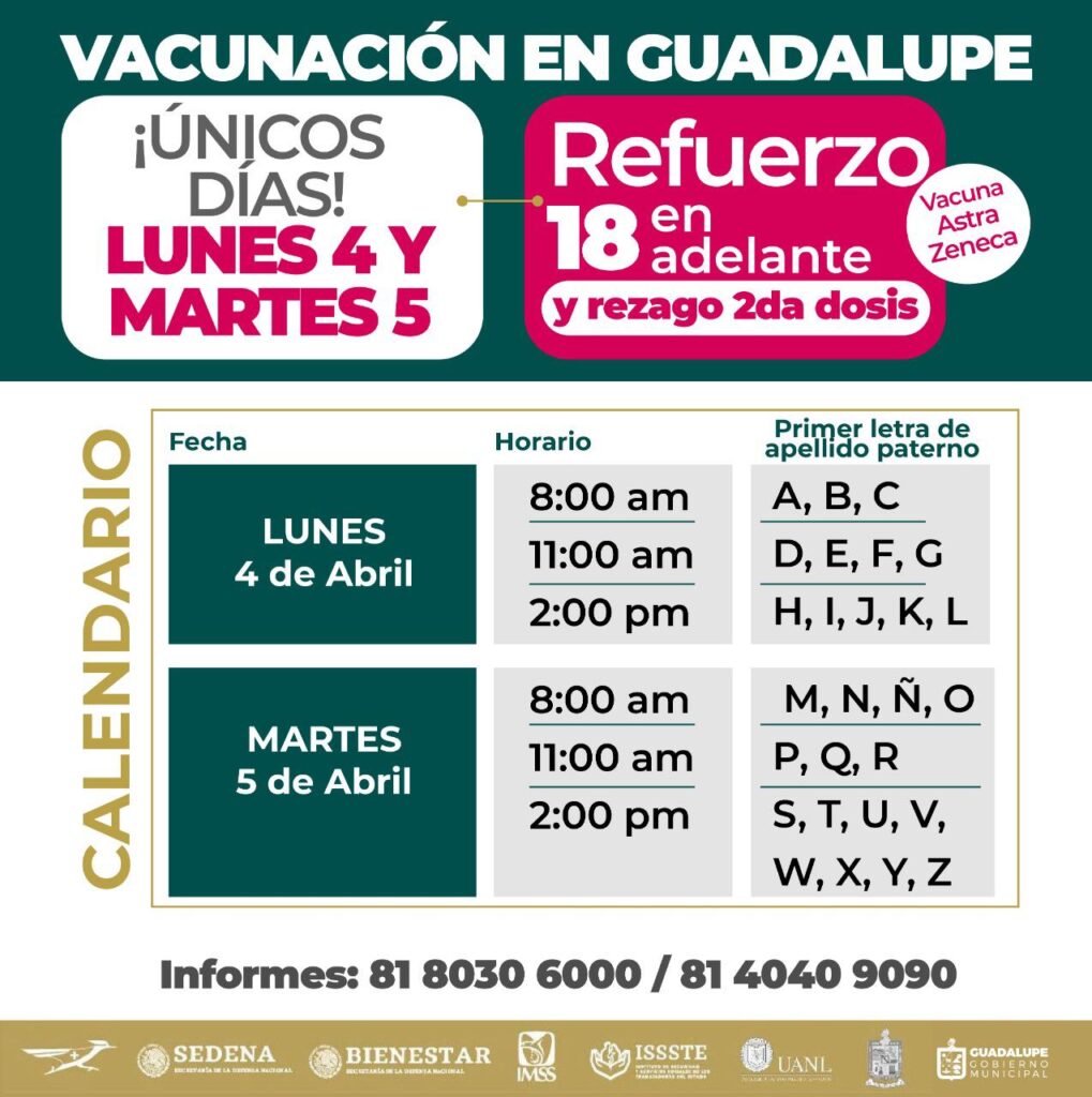 Con las fechas definidas para la aplicación de la vacuna de refuerzo a la población de 18 en adelante y rezago de segunda dosis anti-COVID, el Gobierno de Guadalupe alista la logística e invita a la población acudir los días 4 y 5 de abril a la jornada de vacunación.