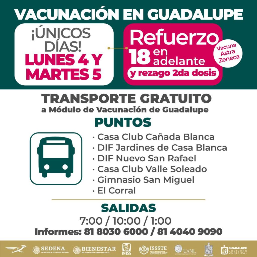 Las unidades de transporte tienes horarios de salida a las 7 y 10 de la mañana, así como a 1 de la tarde; para información general del proceso para recibir la dosis contra el Covid-19, se puede marcar a los números 81-8030-6000 y 81-4040-9090.