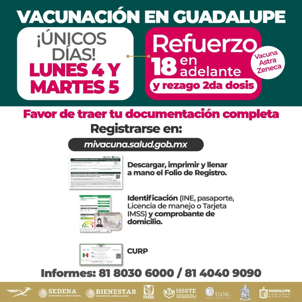 Asimismo, se recuerda a la población llevar la documentación que solicita el sector salud, como el folio de registro en la página www.mivacuna.salud.gob.mx, impreso y llenado;  identificación oficial; CURP y comprobante de domicilio.