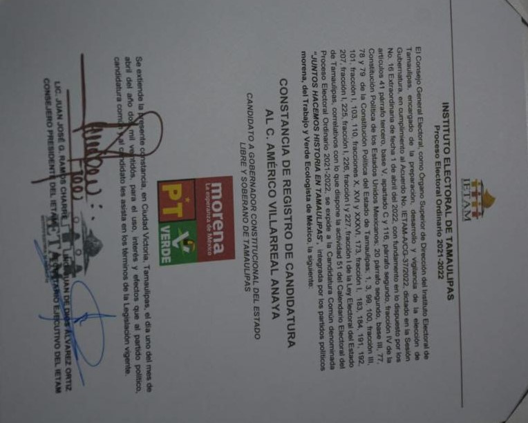 CIUDAD VICTORIA, Tamps.- El Instituto Estatal Electoral (IETAM) validó y entregó la constancia de registro a el doctor Américo Villarreal como candidato de Morena a la gubernatura del estado de Tamaulipas.
