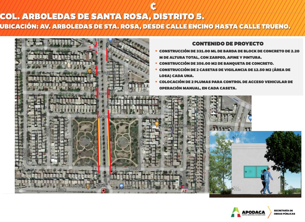 Para mejorar la conectividad del sector y reducir el congestionamiento vial, el Gobierno Municipal de Apodaca, a través de la Secretaría de Desarrollo Urbano y Obras Públicas, dio inicio a la obra de rehabilitación de la Avenida Arboledas de Santa Rosa, ubicada en la colonia del mismo nombre.La Avenida, que hasta ahora se encontraba cerrada al acceso público por los vecinos de la localidad, se rehabilitará para que cumpla su función original, redirigiendo el tránsito vial para conectar la avenida Gasoducto Benito Cantú con la calle Dione.El alcalde de Apodaca, César Garza Villarreal, informó que “la avenida se cerró cuando los vecinos, hace muchos años, blindaron la colonia y cerraron esta calle”. Este blindaje ocasionó, con el crecimiento de la ciudad y del sector Cosmópolis, que la calle Dione sufriera de congestión vial, al grado de convertirse en un problema para los habitantes del sector.El edil explicó que “teníamos el proyecto de rescatar la Avenida Arboledas de Santa Rosa, pero para lograrlo teníamos que proteger el blindaje que los vecinos habían hecho. No sólo lo protegimos, lo vamos a hacer profesional y de manera correcta. Ha sido un proceso de negociación con los sectores. Finalmente logramos un proyecto con el que estamos todos contentos”.Para resguardar la seguridad y tranquilidad de los vecinos, el Municipio invertirá 3 millones de pesos para la construcción de casetas, plumas, bardas, banquetas y enrejado. De esta manera, en 3 meses, los vecinos de Cosmópolis y Arboledas de Santa Rosa, podrán entrar y salir por esta avenida, que los conectará de manera directa con Gasoducto Benito Cantú, reduciendo así el tránsito vial por la calle Dione.En el arranque de obra también estuvieron presentes el Secretario de Desarrollo Urbano y Obras Públicas, Gerardo García; la diputada federal, María de Jesús Aguirre; así como los diputados locales, Gabriela Govea y Filiberto Flores.