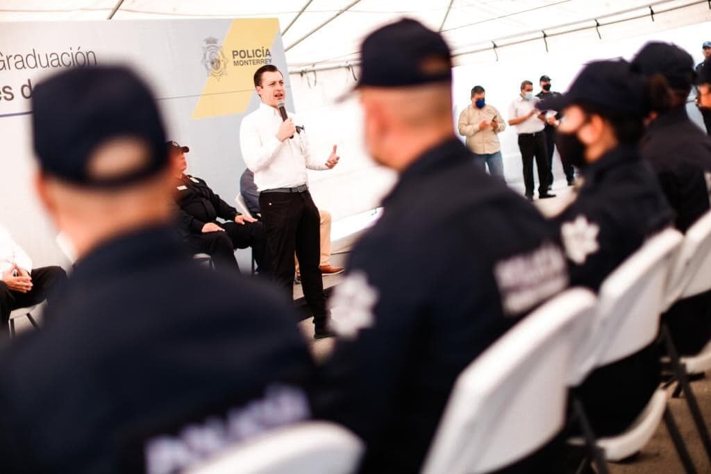 “Esta es la nueva cara de la Policía de Monterrey, junto con sus compañeros que ya están en el campo, junto con sus compañeras que ya están en funciones, ustedes vienen a nutrir, a complementar y a aumentar esta protección y esta cobertura que le debemos a la gente de Monterrey”