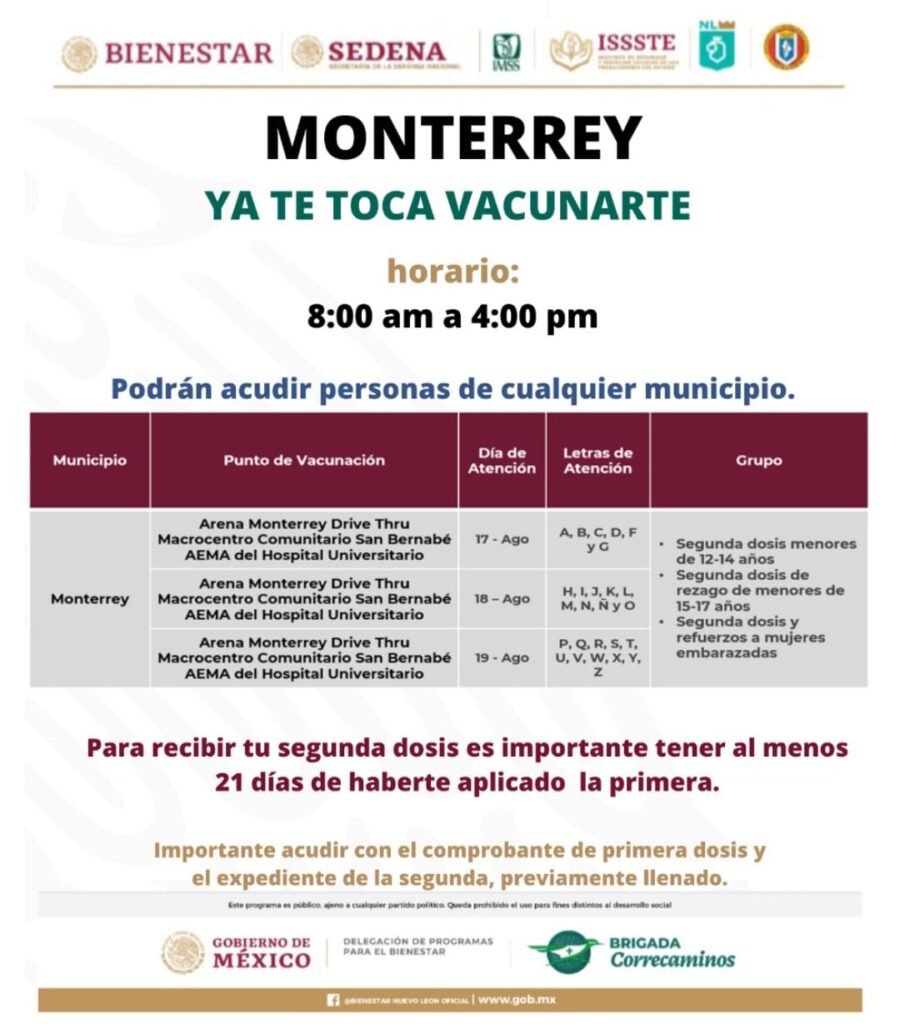 El Gobierno de Monterrey, en conjunto con las autoridades de salud federales y la Secretaría de Salud de Nuevo León, hace un llamado a los adolescentes regiomontanos o de cualquier municipio conurbado, a acudir a aplicarse la segunda dosis de la vacuna anti COVID de mañana 17 de agosto hasta el viernes 19.