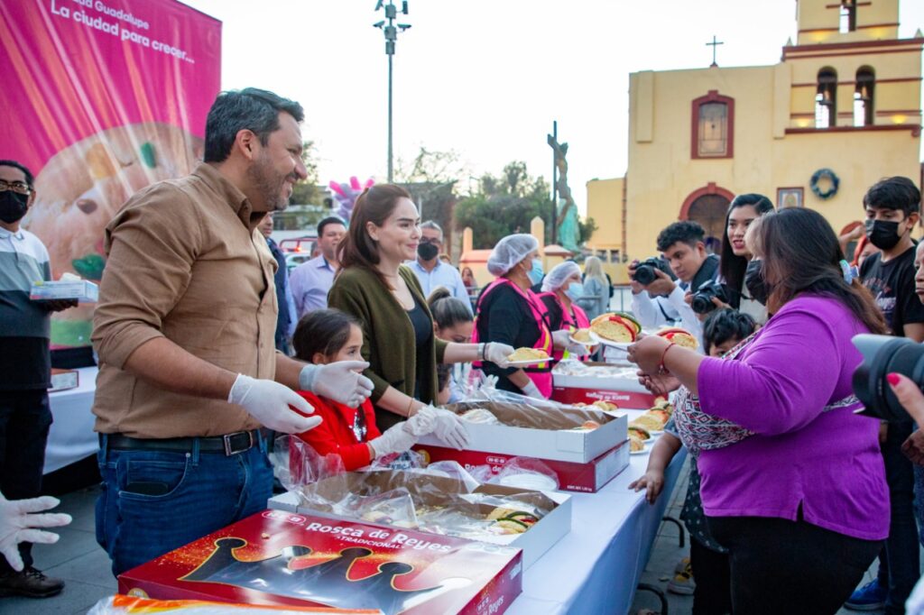 Con el objetivo de celebrar el Día de Reyes, la alcaldesa Cristina Díaz; y el presidente del DIF, Tomás Montoya, compartieron la tradicional rosca con más de 5 mil familias en la Plaza Principal.Tomás Montoya mencionó que las niñas, niños, adultos mayores y familias, pudieron  disfrutar de espectáculos musicales y shows infantiles.Así mismo, Cristina Díaz reiteró que la principal finalidad es fomentar la unión y la convivencia familiar, a través de las tradiciones, además de desearles un mejor año 2023.“En esta mega rosca de Reyes, les decimos feliz año y feliz día de Reyes, Guadalupe es la ciudad para crecer, queremos familias unidas para que sigamos siendo  la ciudad para crecer”, expresó Díaz.Por su parte, Tomás Montoya, comentó que la prioridad es que los niños disfruten un momento de sano esparcimiento y alegría, luego de los dos años de confinamiento por la pandemia por Covid-19.“Sin duda alguna es toda una tradición que teníamos dos años sin poder realizarla, pero nos da mucho gusto poder estar aquí celebrando ésta época tan bonita, les deseo un 2023 lleno de cosas buenas, cosas positivas, lleno de bendiciones y algo bien importante donde no nos falte la unión familiar “, dijo Montoya.Durante el evento, niños y adultos disfrutaron de una rebanada del tradicional pan, chocolate caliente, y además ganaron premios.