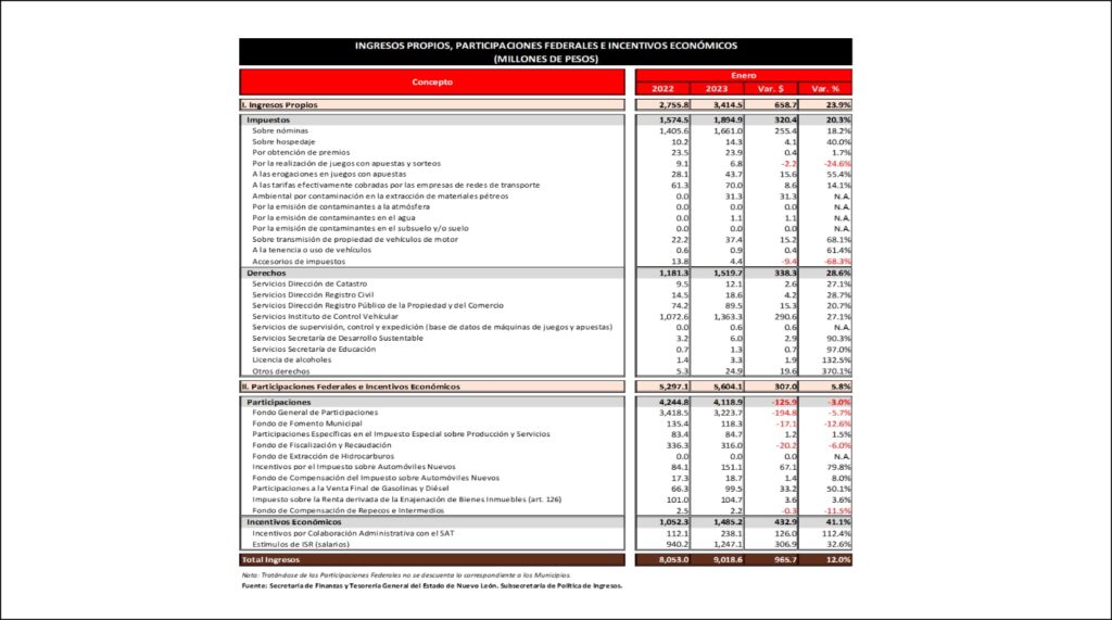 La Secretaría de Finanzas y Tesorería General del Estado, a cargo de Carlos Garza Ibarra, informó que en enero pasado, los ingresos totales del Gobierno de Nuevo León fueron 12 por ciento mayores a los registrados en el mismo mes del año anterior, al sumar 9 mil 018 millones de pesos. Esta cantidad es 9.4 por ciento superior a lo presupuestado.