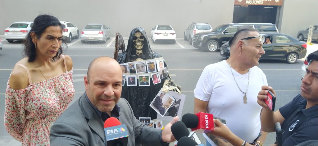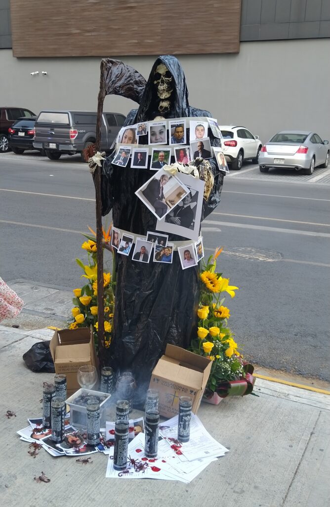 Para apoyar su reclamo Gerardo Ruiz Casio y Alexis de la Torre llevaron a la sede de la compañía una imagen de la Santa Muerte, en la cual colocaron fotografías de otros afectados por el incumplimiento de las indemnizaciones.