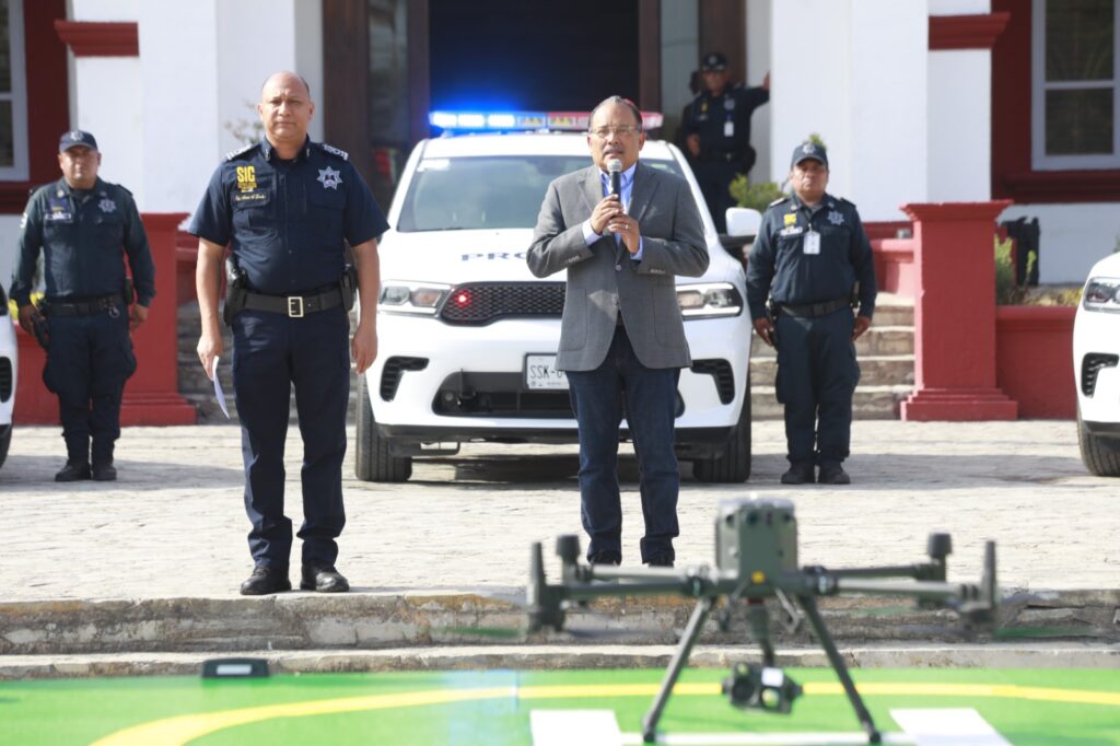 El alcalde Andrés Mijes junto a Marco Antonio Zavala, Secretario de Seguridad presentaron las nuevas 20 patrullas y dos nuevos drones, que se emplearán para labores tácticas y de vigilancia.