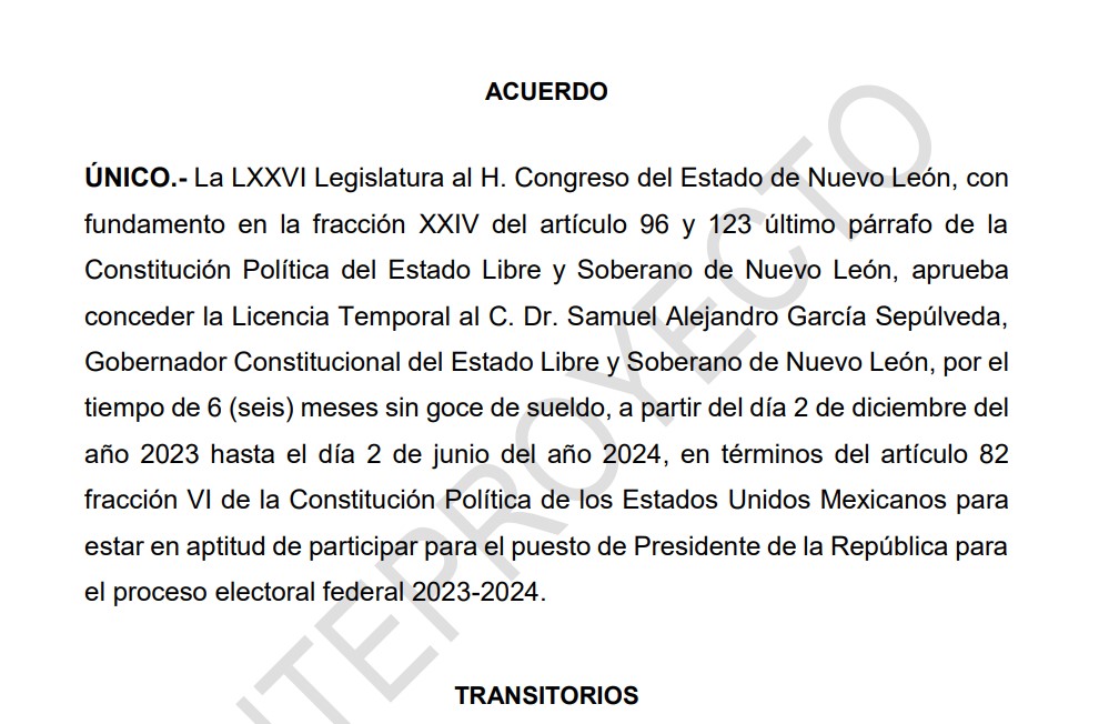 Por unanimidad, la Comisión de Gobernación del Congreso del Estado avaló la licencia temporal solicitada por el gobernador Samuel García Sepúlveda para apartarse del cargo por seis meses, desde el 2 de diciembre hasta el 2 de junio de 2024.