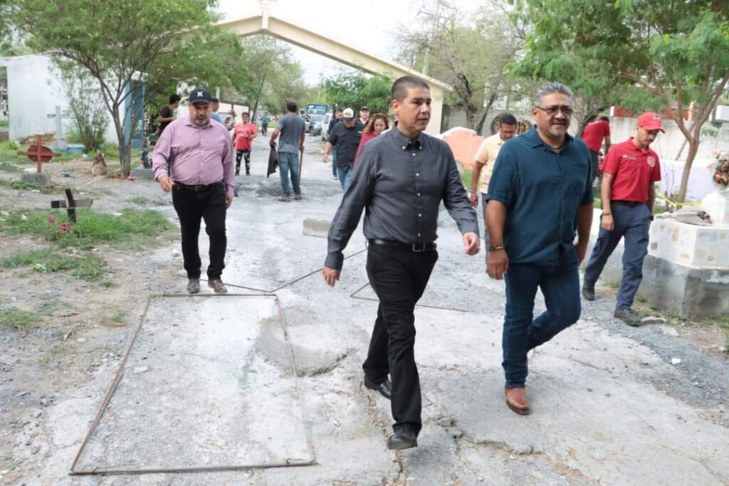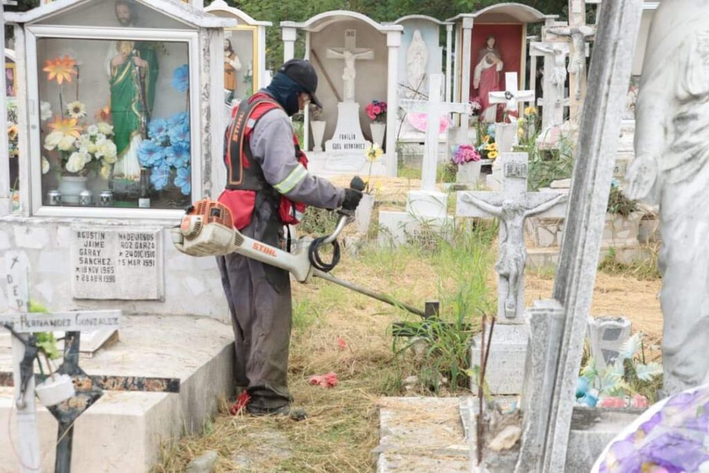 El alcalde Francisco Treviño acudió este fin de semana a los panteones El Rosario 1 y El Rosario 2 para supervisar las labores de deshierbe y limpieza que realizan trabajadores de Servicios Públicos, y la instalación de señalizaciones preventivas por parte de Protección Civil para evitar incidentes a los visitantes, además de los trabajos de fumigación de la Secretaría de Salud.