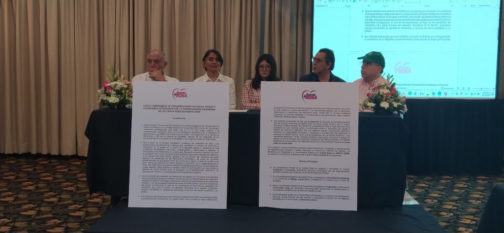 En la presentación estuvieron Santiago Colunga, de Fuerza Rosa Monterrey, Denise Meade Gaudry, del Frente Amplio por México; Eduardo Ramírez Cato, de México Unido; Alisson Padilla, de la agrupación Actívate México Ahora; María Sevilla de México, Unido, y Javier Lozano Ferrat , de NL24.