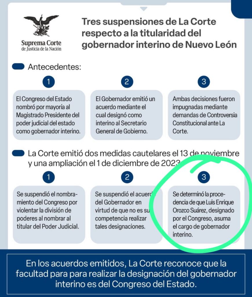 La Suprema Corte de Justicia de la Nación (SCJN) reafirmó este domingo que Luis Enrique Orozco es el Gobernador Interino de Nuevo León.