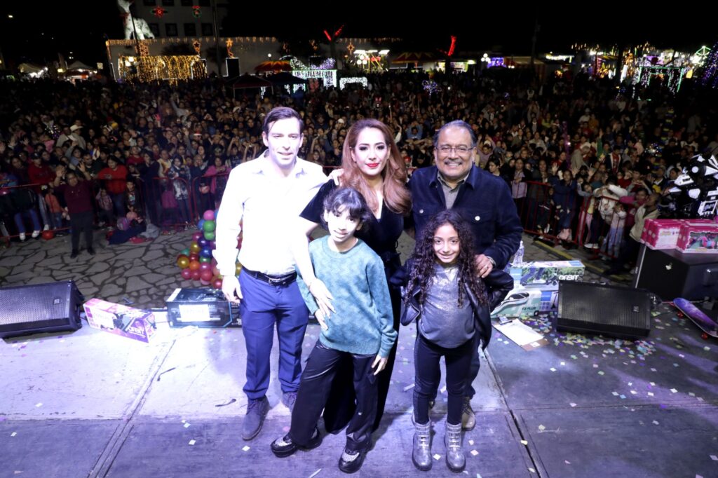 El alcalde Andrés Mijes, junto a su familia, encabezaron los festejos navideños que tuvieron como sede la Plaza Principal del Municipio, espacio que se engalanó con espectáculos musicales e infantiles, además de atracciones como juegos mecánicos y la tradicional Villa Navideña.