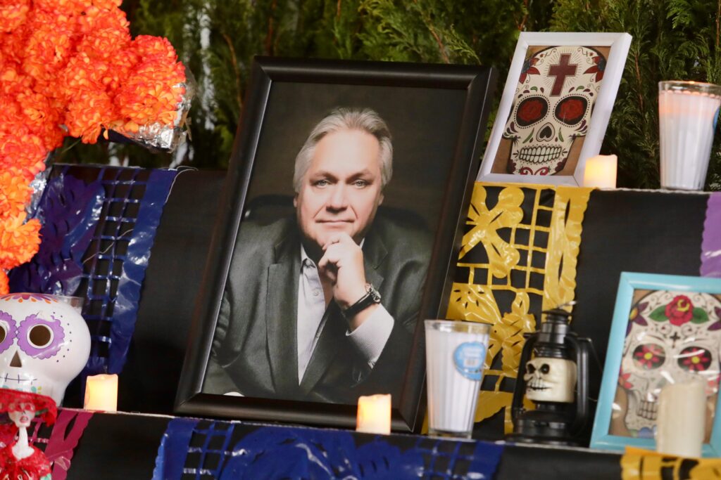 El altar de muertos que fue adornado con las fotografías del comunicador y del capitán de empresa; también contó con pan de muerto, velas, flores de cempasúchil, calaveras de azúcar, papel picado de colores y platos con comida y una cruz colocada en el piso.