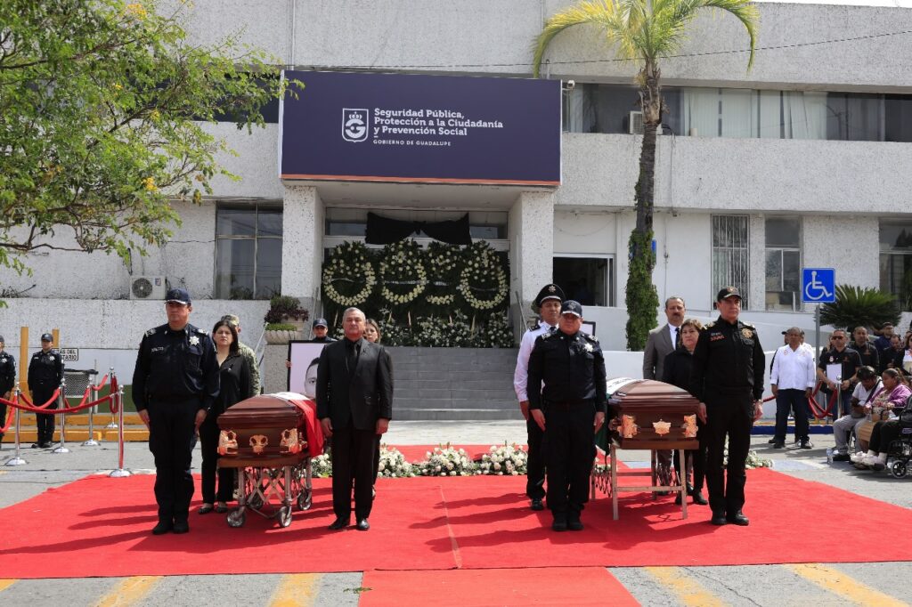 Los oficiales José Eduardo López Campos y Francisco Montero Pérez, murieron sirviendo y velando por la integridad y seguridad de los guadalupenses, por ello reiteramos el respaldo total a sus familias, expresó el Edil guadalupense en el homenaje realizado en la Secretaría de Seguridad Pública municipal.