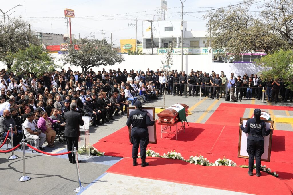 El alcalde de Guadalupe,Héctor García García, acompañado del secretario de Seguridad Pública, Alfredo Fabela, y de familiares de los elementos caídos, dieron el último adiós a los policías abatidos la mañana del domingo en la colonia Luis Donaldo Colosio.