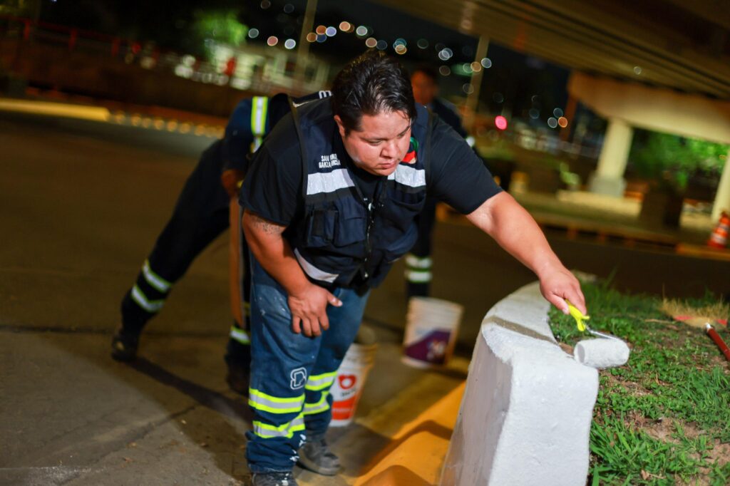 Durante la jornada nocturna se realizaron labores de limpieza, pintura de señalética vial y cordones, reparación de luminarias y bacheo, con la participación de cuadrillas de ambos municipios.