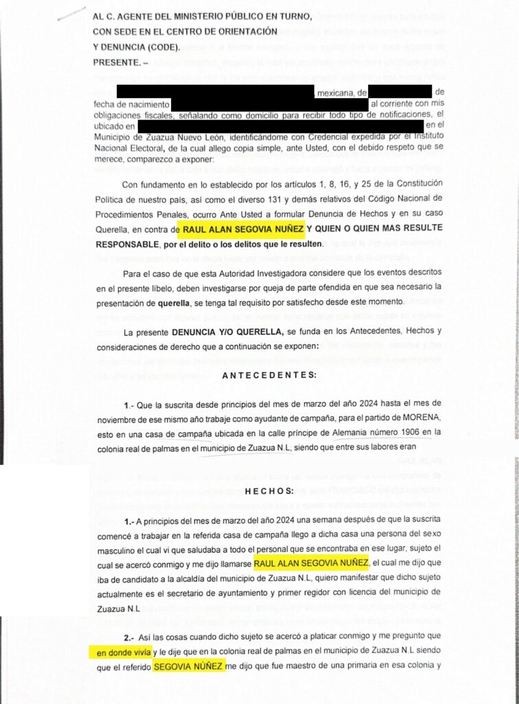 En la denuncia se revela que: “A principios del mes de marzo del año 2024 una semana después de que la suscrita comencé a trabajar en la referida casa de campaña llegó a dicha casa una persona del sexo masculino el cual vi que saludaba a todo el personal que se encontraba en ese lugar, sujeto el cual se acercó conmigo y me dijo llamarse RAUL ALAN SEGOVIA NUÑEZ, el cual me dijo que iba de candidato a la alcaldia del municipio de Zuazua”.