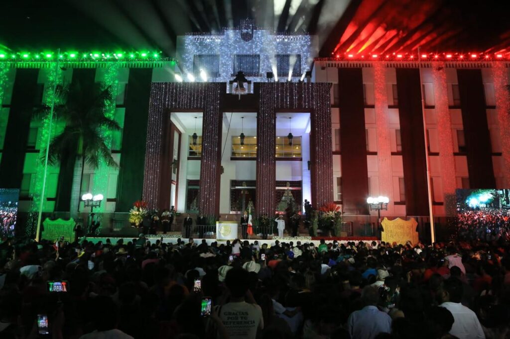 CIUDAD VICTORIA, Tamps.- Miles de familias tamaulipecas se congregaron en la Plaza Juárez de esta capital para conmemorar el 215 aniversario del Grito de Independencia, acto encabezado por el gobernador Américo Villarreal Anaya, quien en su arenga vitoreó a nuestros hermanos y hermanas migrantes, a la honestidad y la justicia, y a los independentistas tamaulipecos.