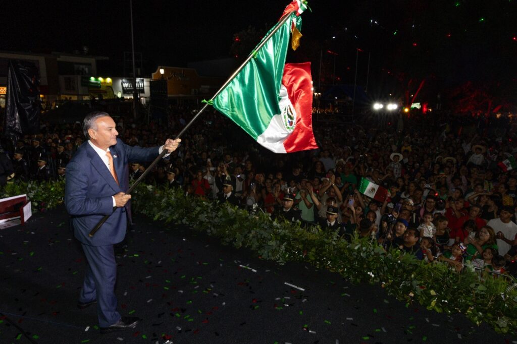 Al grito de ¡Viva México! y en un ambiente de algarabía, luces y colores, con un show de drones, el edil celebró el acontecimiento histórico, con el cual hace 215 años se logró la emancipación del país.