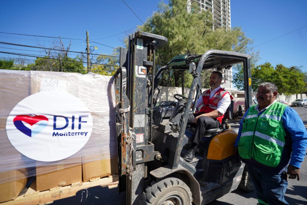 El edil apoyó conduciendo el montacargas que subió las 63 tarimas acopiadas, casi 40 toneladas, y agradeció a los regiomontanos que apoyaron la causa.
