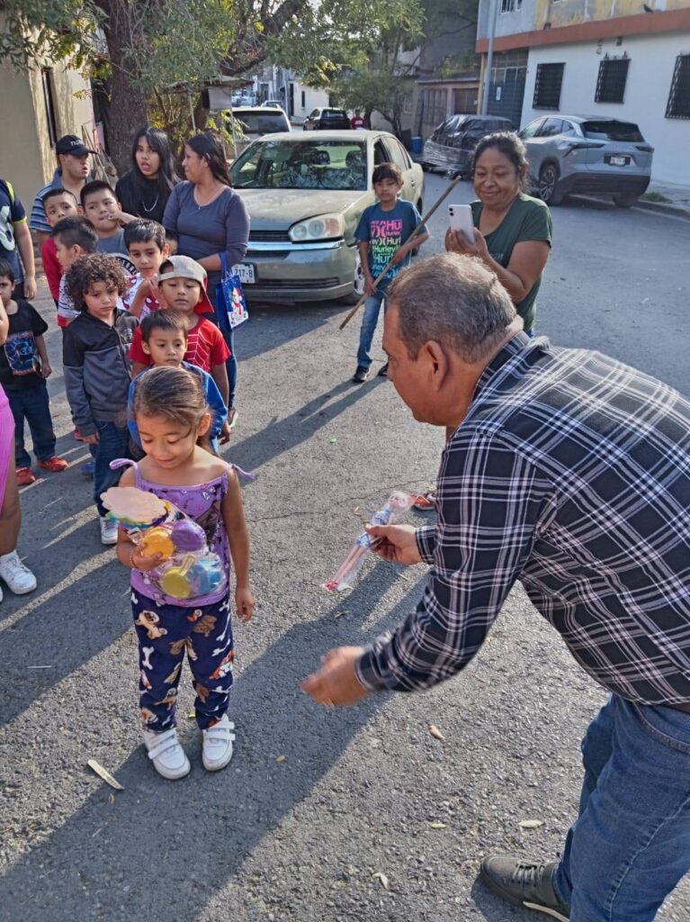 El “Santa” fue encarnado por el presidente de las Organizaciones Vecinales TESER, Osvaldo Serna, quien se pasó toda la tarde visitando los barrios, aún cuando el sol todavía pegaba en las bardas, entregando juguetes a los chiquitines regiomontanos y, luego, agasajó a niñas y niños de Apodaca.