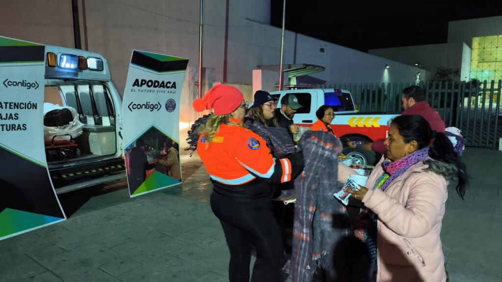 Ante las bajas temperaturas que se registran en la entidad, la Dirección de Protección Civil del municipio de Apodaca reforzó las acciones de apoyo a la población, mediante la entrega de cobijas, chocolate caliente y galletas a personas expuestas al frío.