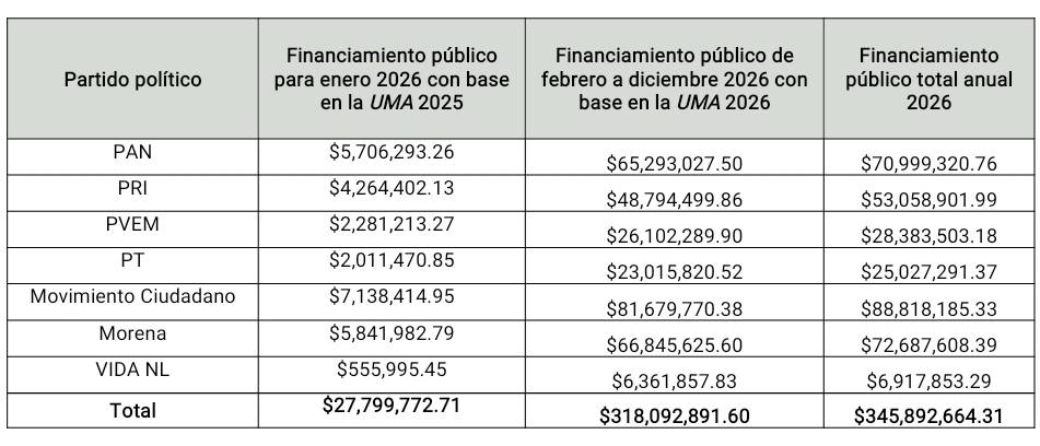 El Instituto Estatal Electoral y de Participación Ciudadana de Nuevo León (IEEPCNL), estableció el financiamiento público de los partidos para el 2026, que asciende a un total de 345 millones 892 mil 664.31 pesos, en sesión extraordinaria de este 15 de enero,