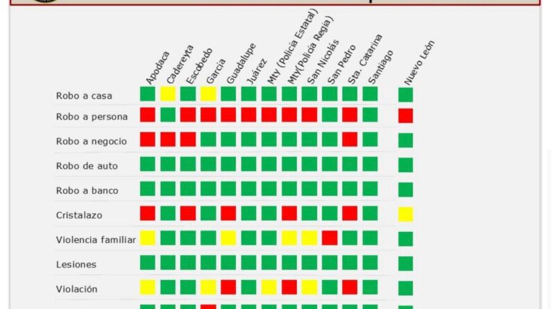 Entre los avances más relevantes destaca violencia familiar, que pasó de rojo a verde; cristalazo, que también mejoró de rojo a verde; y violación, que pasó de amarillo a verde, lo que confirma que la estrategia implementada está generando resultados concretos.