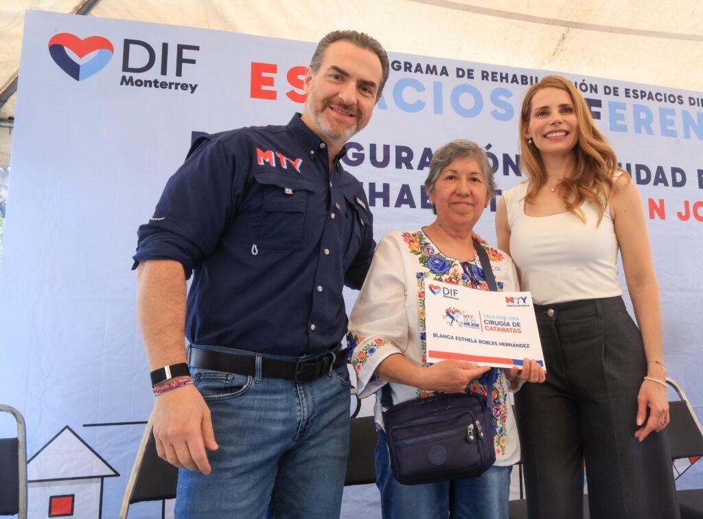 El alcalde Adrián de la Garza y su esposa, la presidenta del DIF Monterrey, Gaby Oyervides, entregaron este viernes comprobantes oficiales que avalan las cirugías como parte del programa “Mty se ve mejor sin cataratas”.